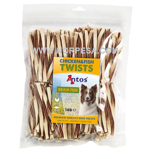 Nuestros Chicken&Fish Twists están hechos de tiras de pollo y de abadejo en una forma enrollada. Bajos en grasa naturalmente y con un delicioso sabor que tu perro adorará. Estos manjares ayudarán a mantener una piel y pelaje sanos.