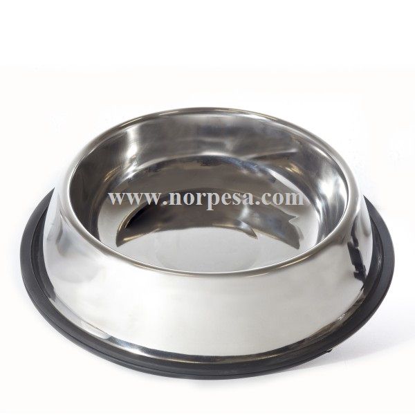 Comedero bebedero de acero inoxidable, con base de goma que lo hace totalmente antideslizante y base amplia que impide que el plato se vuelque.