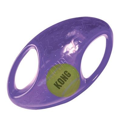 El KONG Jumbler es una pelota dos en uno para el doble de diversión interactiva. La pelota de tenis en el interior y el sonoro chirriador incitan a jugar, mientras que las asas permiten recoger y agitar la pelota más fácilmente. El Jumbler ha sido diseñado como juguete resistente y es ideal para jugar a buscar. Disponible en dos formas y tamaños, el KONG Jumbler garantiza un juego emocionante y activo para usted y su perro.