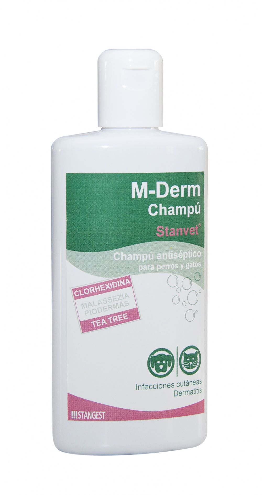El champú M-Derm contiene clorhexidina,antiséptico de acción bactericida y fungicida. Su acción antiséptica se debe a que causa la disrupción de la membrana de la célula microbiana alterando su permeabilidad. Contiene tambiénÁcido Bórico,cuyas propiedades antisépticas sinergizan con las propiedades de la clorhexidina, siendo especialmente eficaz contra Malassezia. La combinación de las dos sustancias permite abarcar un amplio espectro de micoorganismos, aumentando así su eficacia.